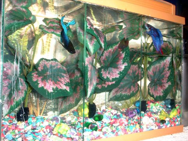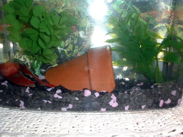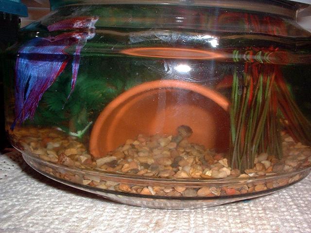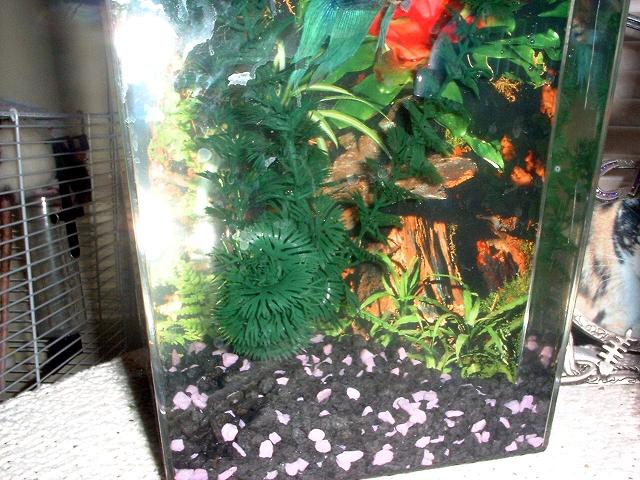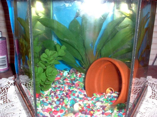Here is Mr. Butterfly's house. It's really simple. I don't want it gooped up because I'm afraid his fins will rip. It's a three gallon hex with a light.