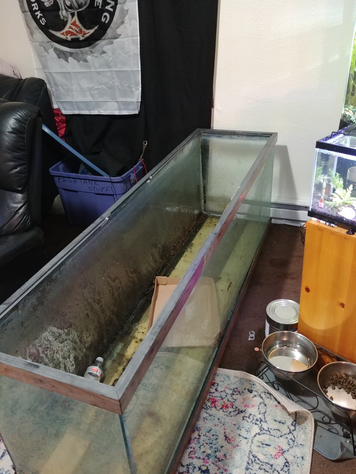 So I ended up with a giant tank. I am looking for my measuring tape, but I think it is more than six feet long. It is very dirty, and has been sitting out for awhile. I am having a custom stand built for it (only about 2 feet tall, I want perfect viewing height to be from my sofa). How do I even get a filter big enough for this? Several sponge filters and a couple giant hobs? I don't think I want a canister.