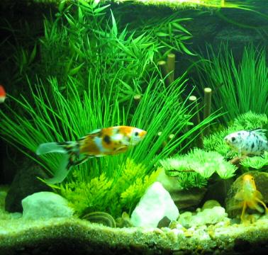 hi i helped my sis with her tank last week its 10g's with pretty shells and a small castle and i thought 'why not put floating plants in there' so when we went to the lfs the day after she chose a small black moore 'which dont appeal to me' i would of gone for a commet i just luv orange lol