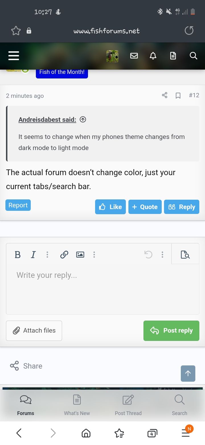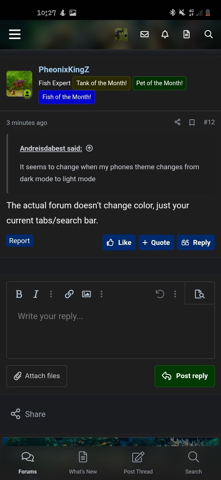 The actual forum doesn’t change color, just your current tabs/search bar.It seems to change when my phones theme changes from dark mode to light mode