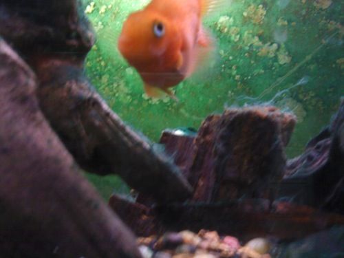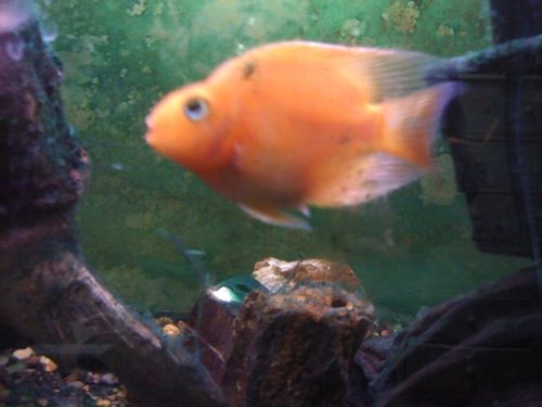 Tank inhabitants: 3 blood red parrots (2 juvies, 1 adult), 1 juvie green severum, 1 adult black ghost knifefish, 1 juvie albino bristlenose pleco, 1 pair adult kribensis