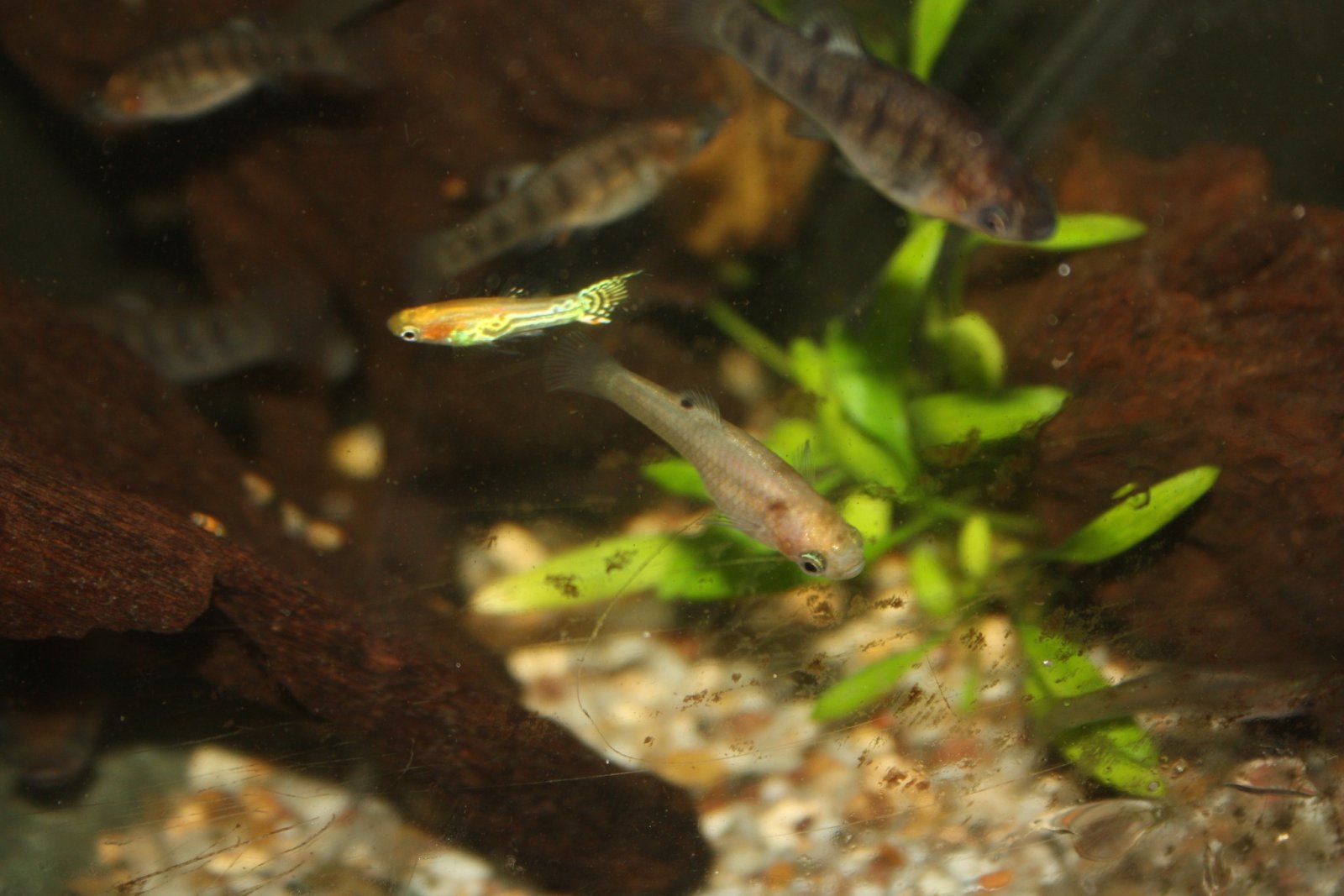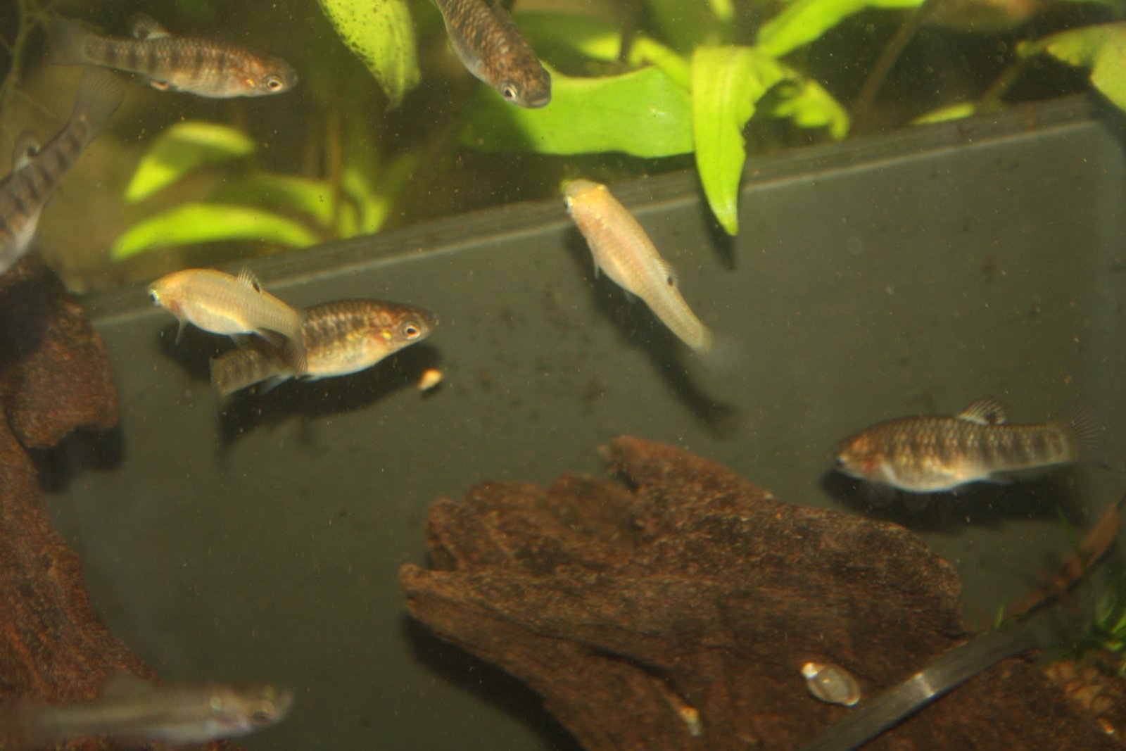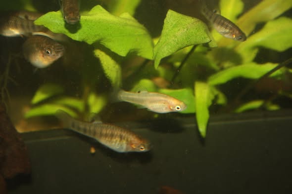 Well, some time has already past that three blond humpbacked limias (Limia nigrofasciata) were born. The sex of them is still unclear. They also don't grow as fast as the regular wild colored ones. Thusfar, I and others don't have any clou why blondes were born. They're not leucistic. They're too blond to be leucistic. It's my intend to make a separate line out of them. But first I do need to know their sex. Females won't show a gravid spot. So, that won't be of any reference. And at this stage the anal fin won't show it either.