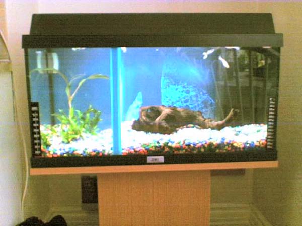 Here goes, A jewel 50, it a 2ft by 1ft by 1ft tank and has an internal filter, the tanl is split with a tank divider 1/3 of its width. the small side has planted java fern for the fry to hide. and it has currently a pregnant guppy and a baby sailfin molly. the larger part has a piece of bogwood, ( some plants will follow ) this contains one male guppy, lyetail leopard colouration. also 3 female guppys and a one inch albino bn plec.