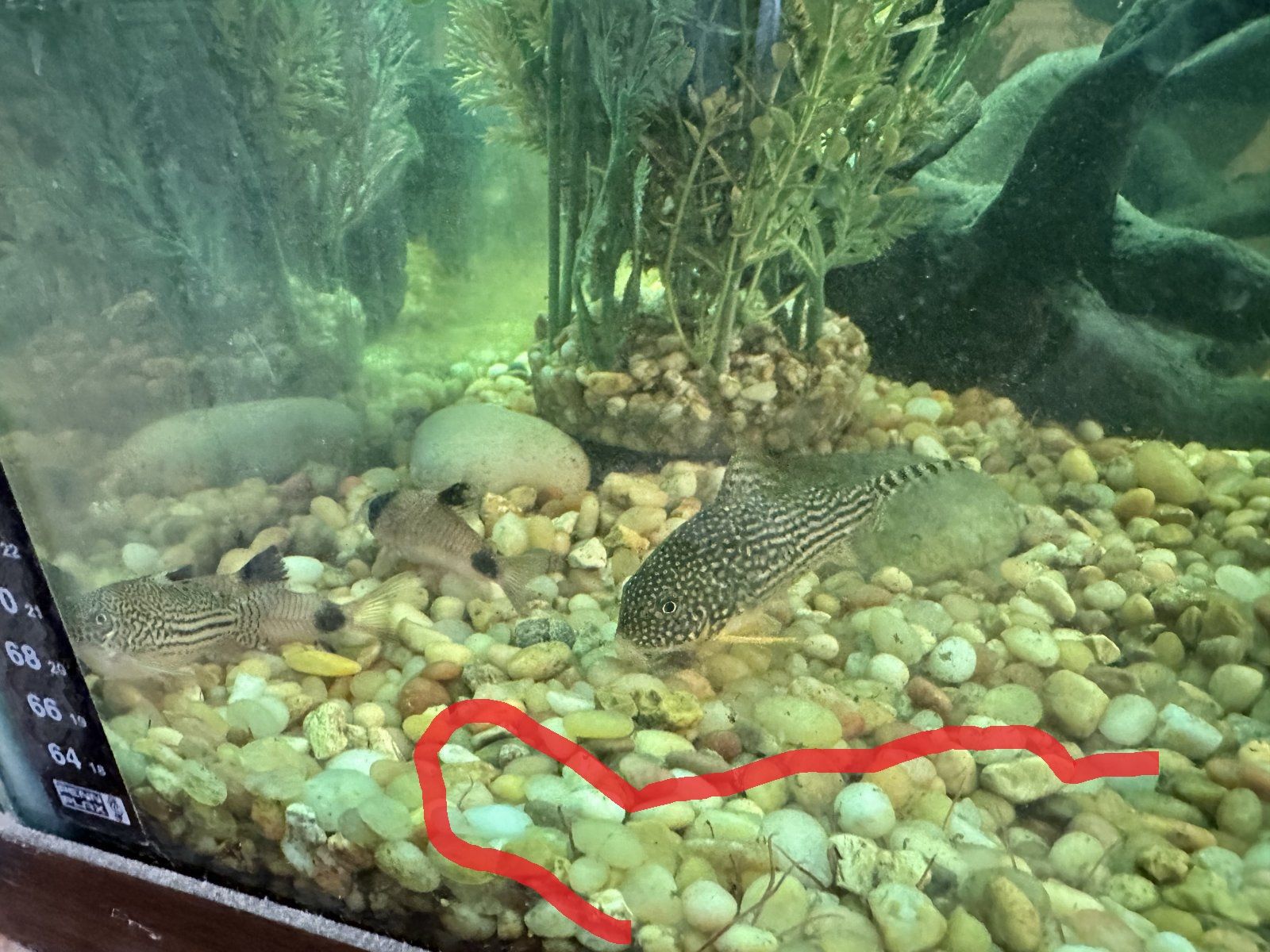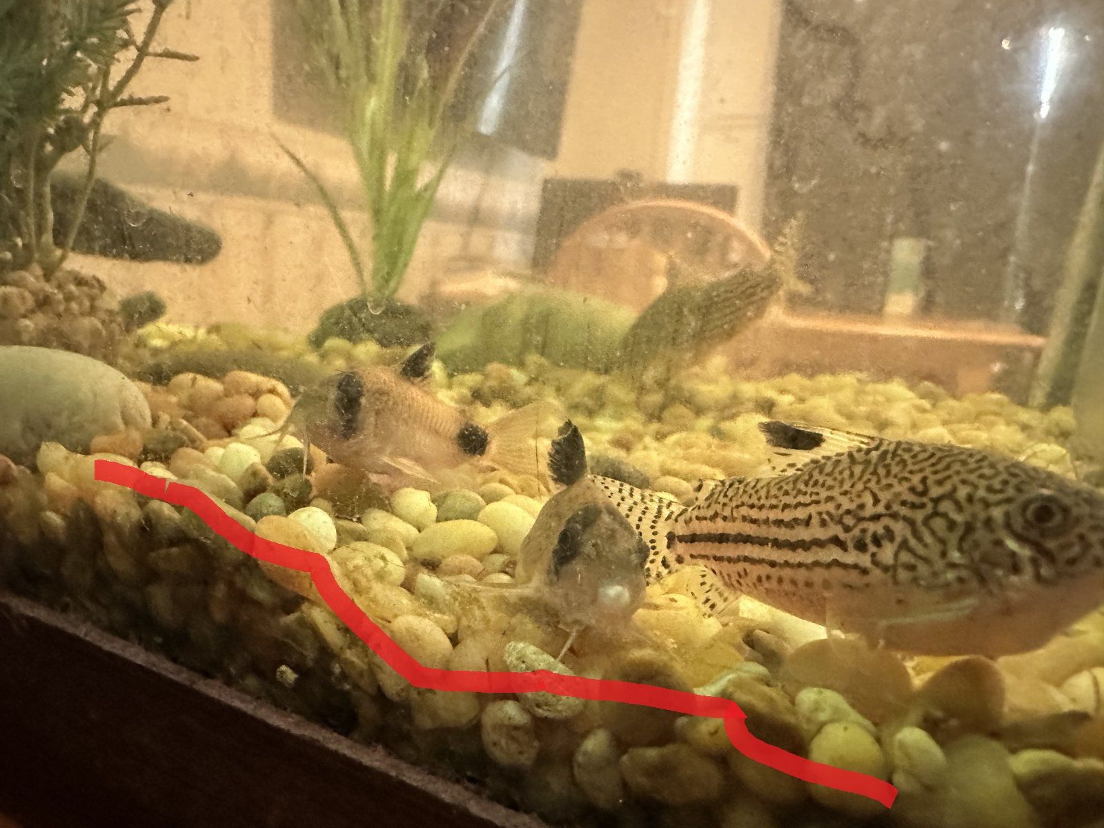 Below the line I added to this photo where the gravel meets the glass shows that you're not gravel vacc-ing that deeply. The brown and black build up under the gravel is mulm, dirt, and organic matter and waste. Some of this is harmless, but this is a lot, and too much of it again, harbours all those potential nasties.