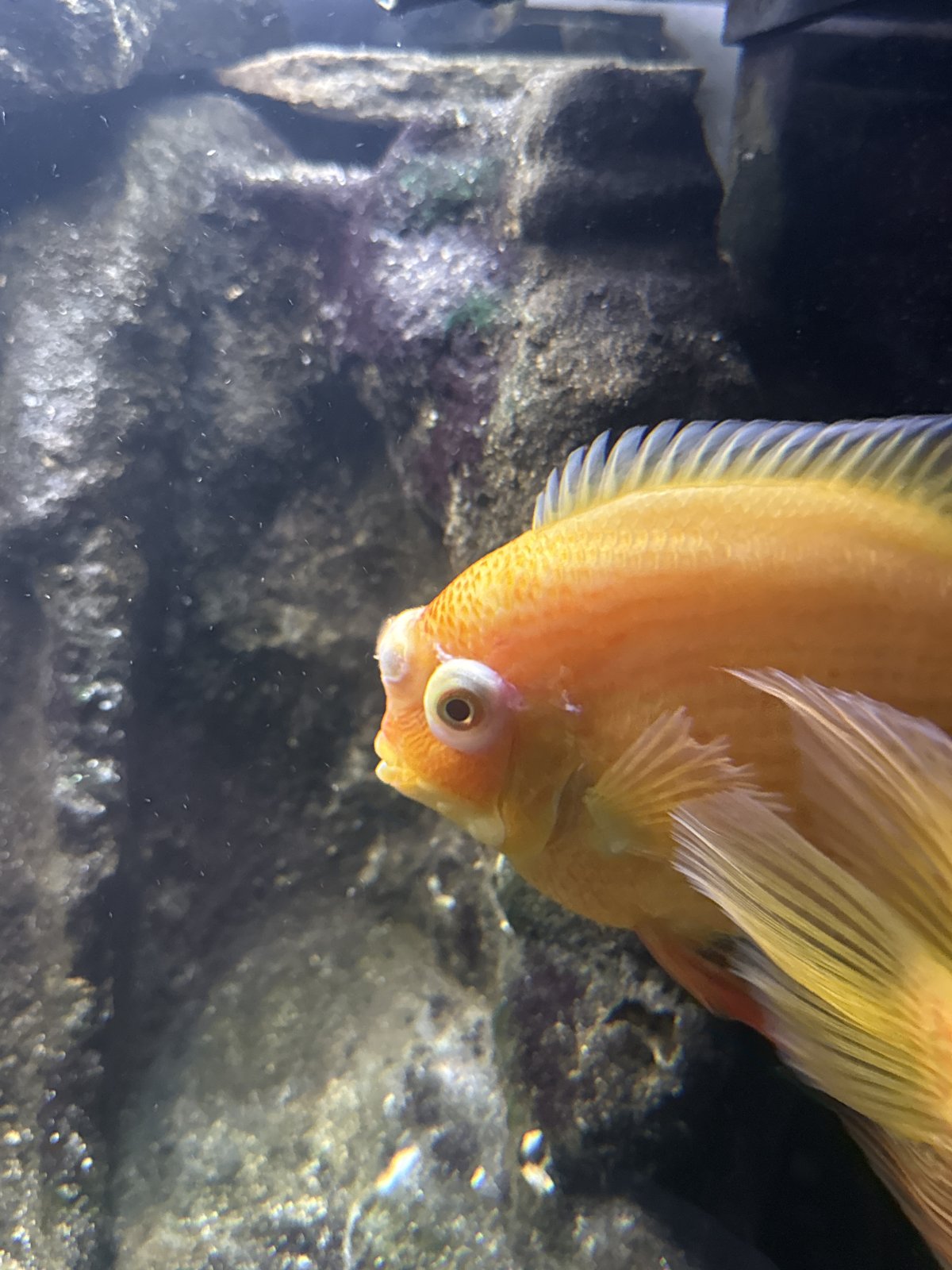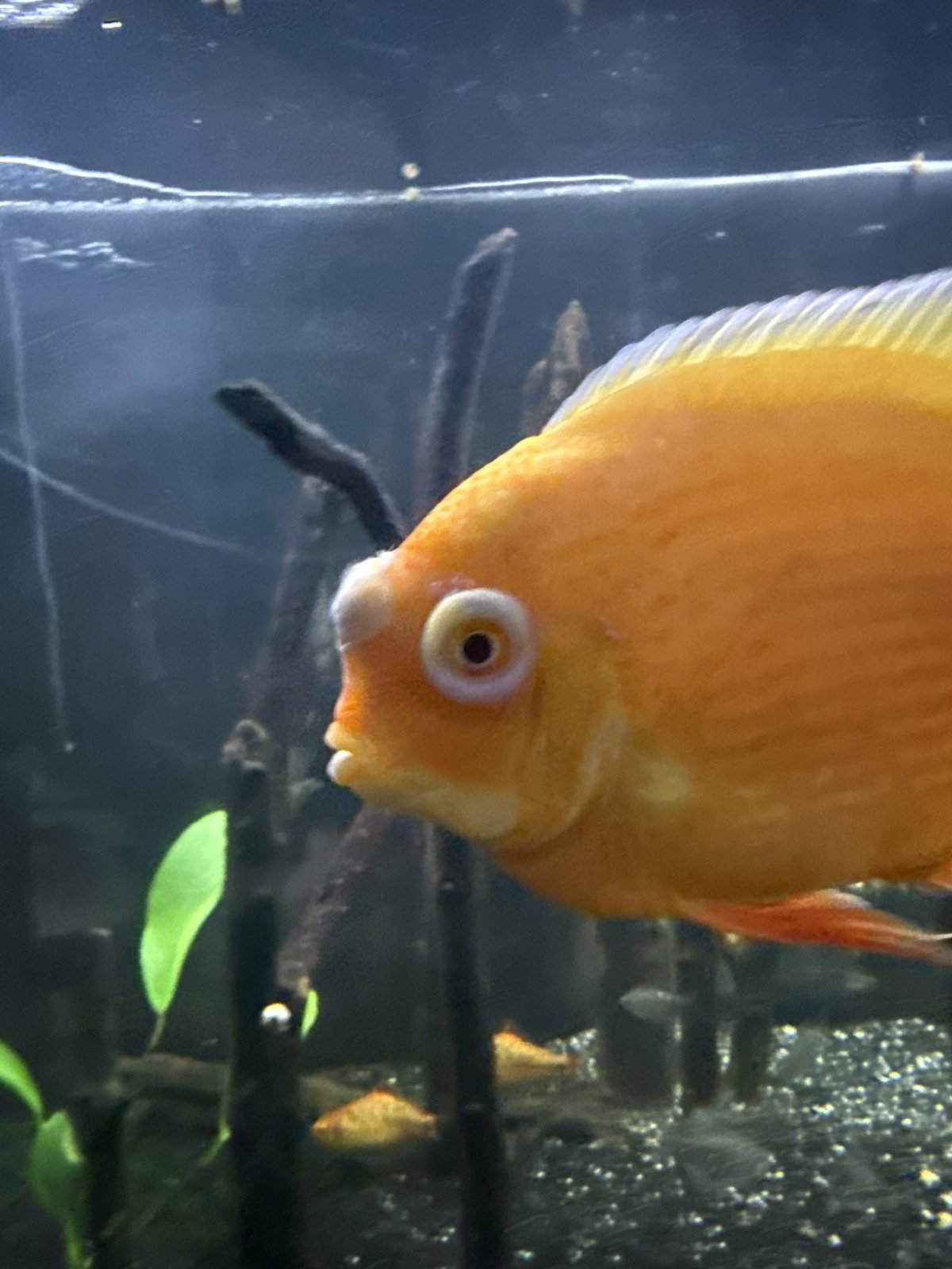 It's excess mucous over the eye but the eye also looks like it's bulging out more than normal. You will be able to see both sides of the fish to see if it is sticking out more. That is normally caused by an injury to the eye or an infection or swelling in the skull. An infection in the brain or skull can be from bacteria, virus or protozoa. It's unlikely to be protozoan because your tank should be pretty clean and protozoan infections in the brain cause the fish to lose balance and spin/ spiral in circles as it progresses.