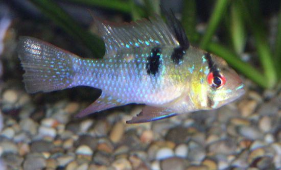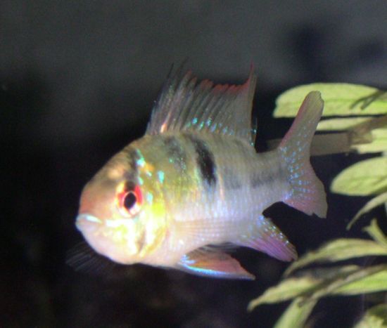 If you look closely you can see a small white object below the skin of the fish about 3/4 the way back along the dorsal fin and just below it. There is a much larger object near it's head, but on the opposite side to that shown. It is just visible as a whitish lump in front of the dark stripe through its eye. The photos don't show it up too well. In reality it's very clear. My other ram also has small off white objects appearing below the scales. Both fish are off colour and don't behave like healthy fish at all. There's no fighting and they just wander about with no real go to them.