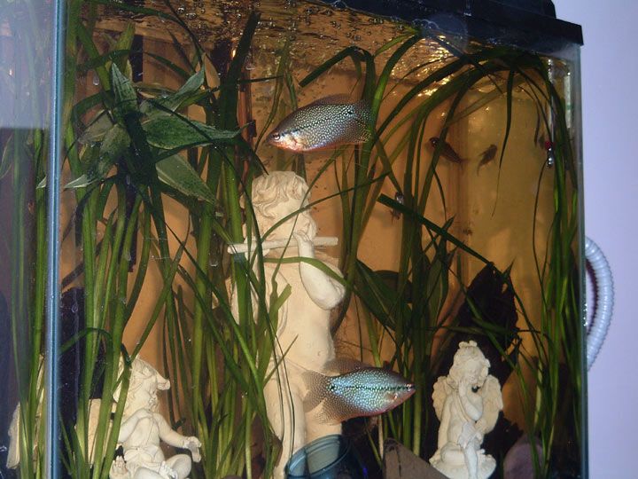It is a 17gallon tank, it has gouramis, cory cats, yoyo loaches, dwarf neon rainbows,and I think a lady betta. The statues are unpainted resin from walmart garden section. The fish DO love it :> I'm sure Candace appreciates the nominations :>