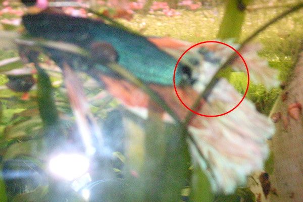 Where the caudal fin joins the body there appears to be some sort of blister within the caudal fin. The portion of fin that extends from the "blister" has now gone so he has a "V" missing. The ends of the caudal fin are not bloody or red.