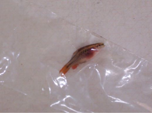 I haven't been able to get pictures of this fish while she was sick, and now that she has finally died I got a few. I've puzzled over her symptoms for a long time now, so I'd like a little help. Her history started with camallanus worms when my entire tank was infected. She was one of the worst cases, and was very bloated with worms. I successfully treated the tank though, and she lost all her worms, though not all the bloating. Since then she got fatter and fatter, abnormally so. Within a few months she started to lose her swimming ability, and would twirl around with her head down. She continued eating throughout all of this. Then something looked like it was sticking out her side, sort of a bubble. It seriously looked like she was going to explode, so I put her in quarantine, where she had been for a few weeks. She finally passed on today, and it looks like she had internal bleeding or something. What could cause this? My only guess is that the worms left too many holes in her intestines, and maybe she had fluid in the abdomen (never any protruding scales though). However, this darkening didn't show up until recently.
