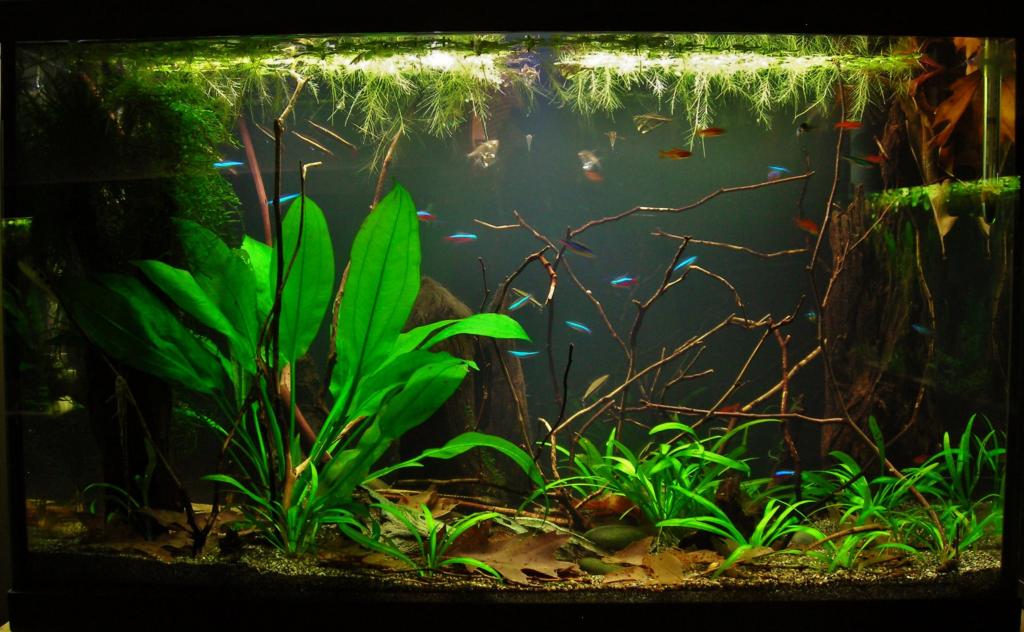 Here's a photo taken just a moment ago of my 29g that I re-set yesterday, so it is still a bit hazy. But it is about as authentic for the fish species as one can reasonably get. That's the play sand, with oak leaves, and branches. A few
