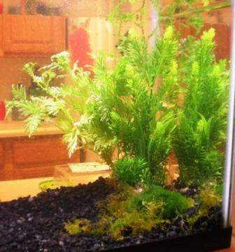 There are some fake plants in there. I am skeptical of real ones because last time i brought in real plants i ended up with a back snail infestation and some really fat clown loaches lol. but where could i find some java moss? or other plants the babies will enjoy? And how do I keep them from bringing in snails?I moved my babied into their new home. They look even tinier in the 10 gallon than they did in the net!very cool i do the same myself if i dont have a free tank. i will leave these fry in the net breeder for a week or 2 and feed them up on artemia then they will get there own tank all to them selves*)