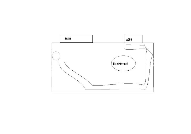 I know this is probably subject to opinion, but I'm trying to decide the best place to locate my pump. It is going to be in a standard sized 75 USG tank. One side of the tank is going to have an AC110 and the other is getting an AC50. The tank is going to be planted, so the main goal is to avoid any deadspots. Would it be smarter to place the pump on the side with the 110 or the 50? Check out my fab drawing and my idea for placement: