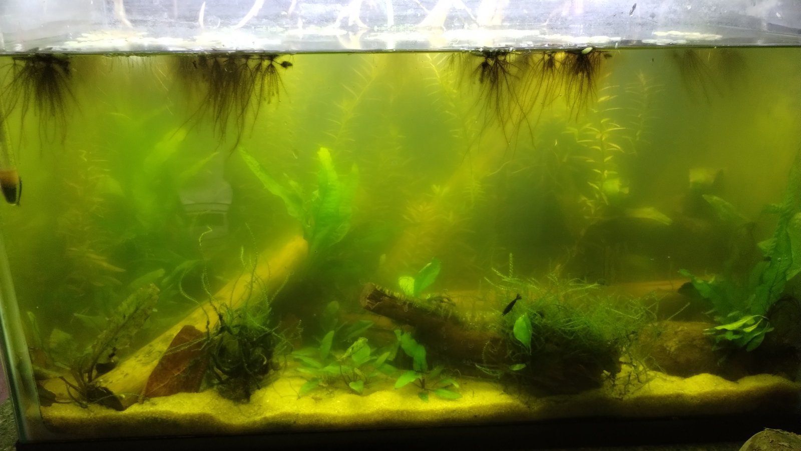 Heavily planted with crypts, java ferns, rotala, salvinia minima, and Christmas moss. Scaped with pool filter sand, some maple wood, and a few IA leaves. I have a little cyanobacteria, but I don't think it's the culprit for the cloudiness.