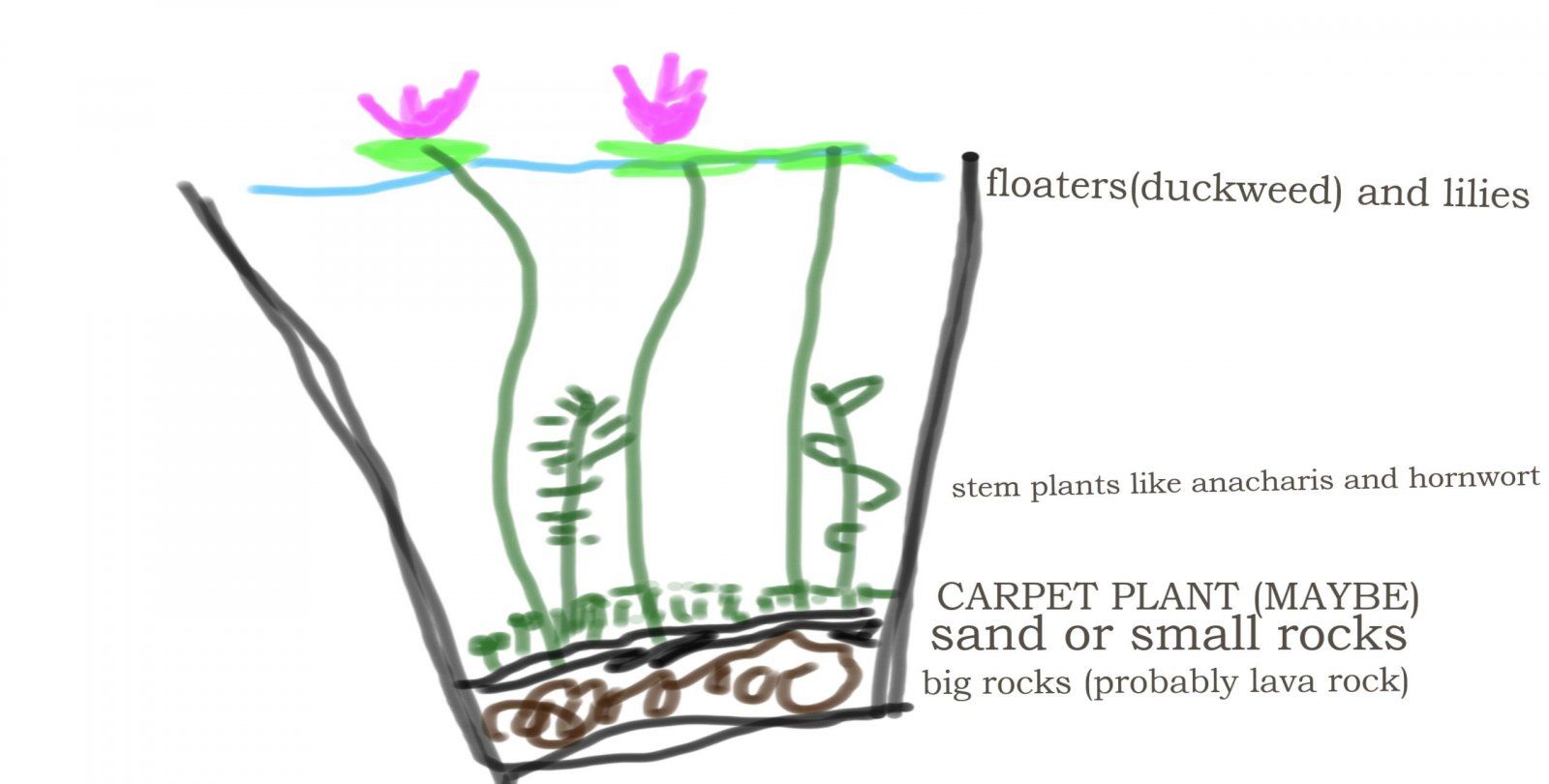 this is how I made mine. I got a 42 gallon barrel planter. I got small, thick, pond liner. Black rubber. I fastened it using washers and screws. I then filled with pre-cycled water from my 55g. I added Pea Pebbles. Then, I got Anacharis, Hornwort, and Variegated Water Snowflake. Very simple. I don’t have a filter. I have 5 Rosy Barbs and a few snails. There is no filtration, nothing. Rosy Barbs are very hardy.