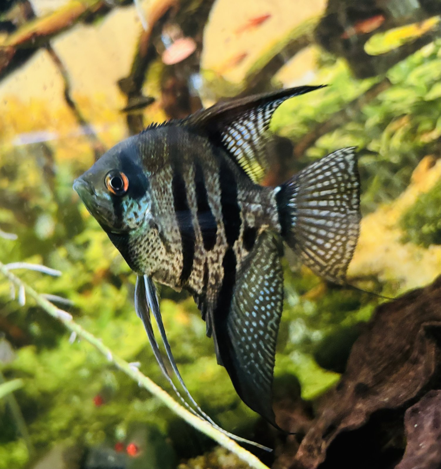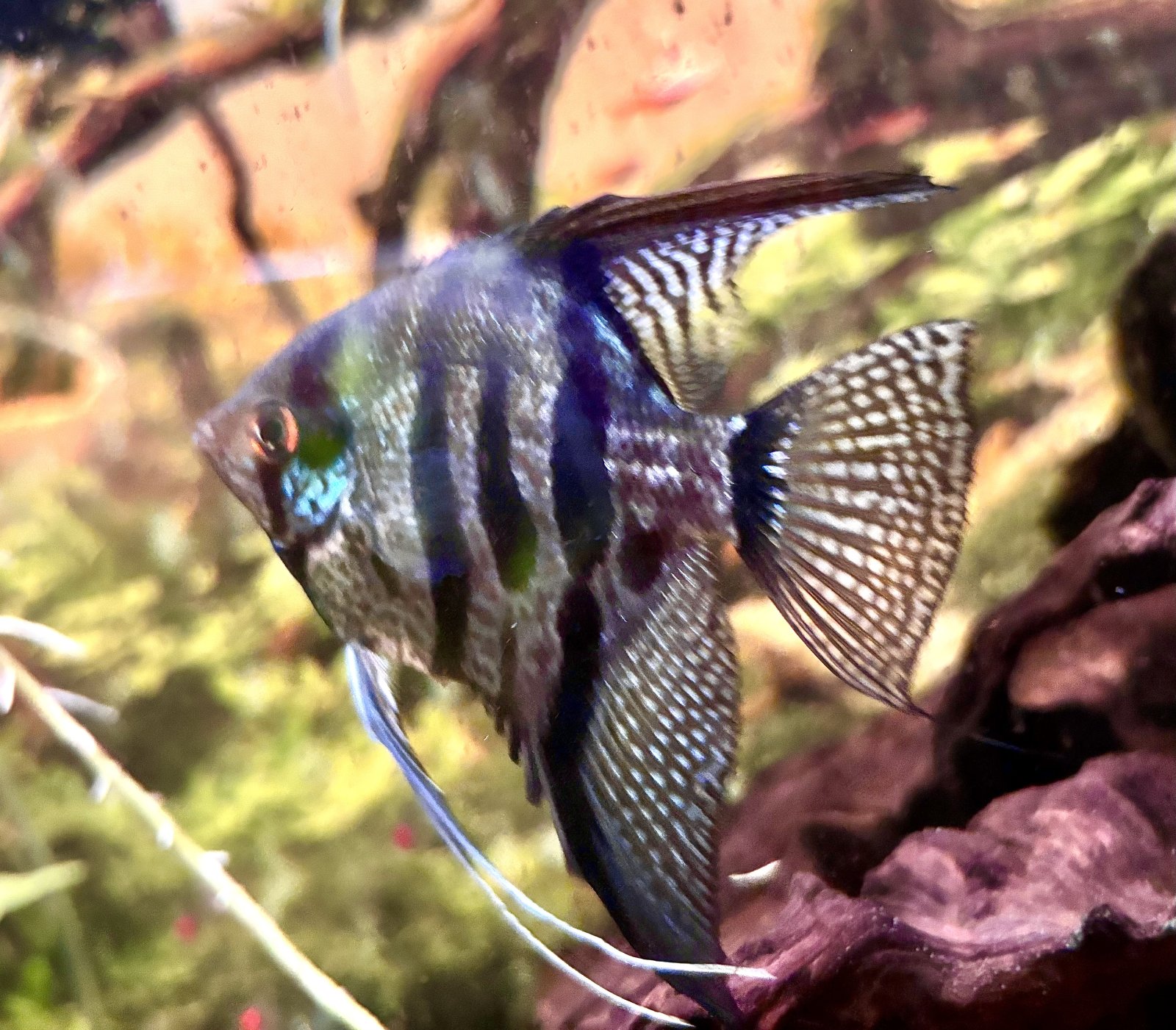 I’ve been trying on the blues, as well, right now my electric blue rams, and Acaras are “brilliant” but at this point, I’m assuming is just from a varied diet ( and their breeding ) but my Zebra Lace Angel seems to be coloring up also… my New Blue Diamond Angel, currently has no blue, so I’m hoping, since it has the genes to get some blue, that I can get that one there… but that color does seem to be more light dependent, than yellows or reds…