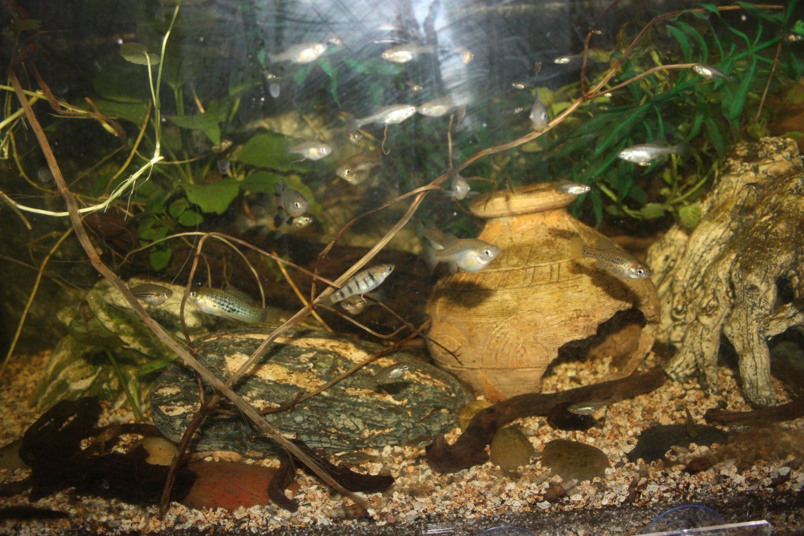 This community tank contains: Skiffia multipunctata, Xiphophorus nezahualcoyotl and Limia islai.