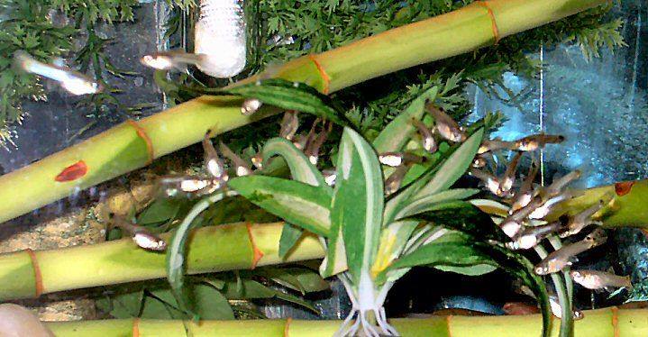 Here's the majority of the fry scarfing down one of the bettas algae covered plants. Gotta love their appetites But this time it took a little longer for the cleaning.
