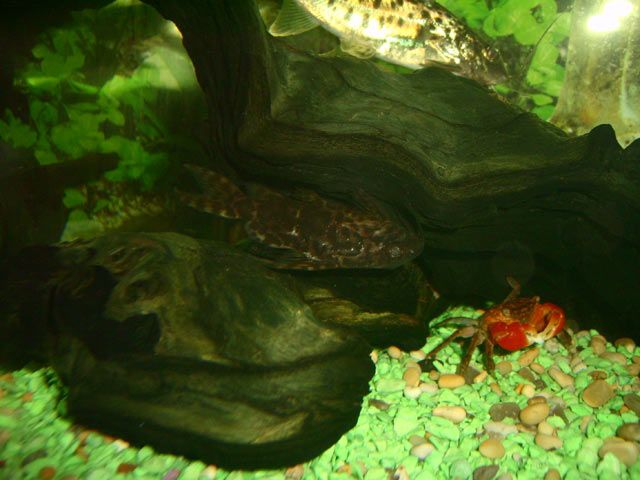 seems im breaking all the rules, but the only one i wish to correct is the "brackish" rule, sadly my crabs are not true freshwater. cant help thinking that there must be some, "freshwater" crab. my guess is that if there are they will be "coldwater". till i sort my "brackish" tank. i will continue to enjoy the sight of all my crew, living, and getting on! The sight of a Plec carrying off a rock shrimp, only to drop it and just sit on the bottom together afterwards, just has to be seen. seeing a pygmy gurami bullying a crab to get it to move is amasing.I guess the personality of the tank and its fish is as varied as the fish and the people who keep them .Great pics! I'm fairly amazed at your tank set up. Big fish, crabs, and shrimp.