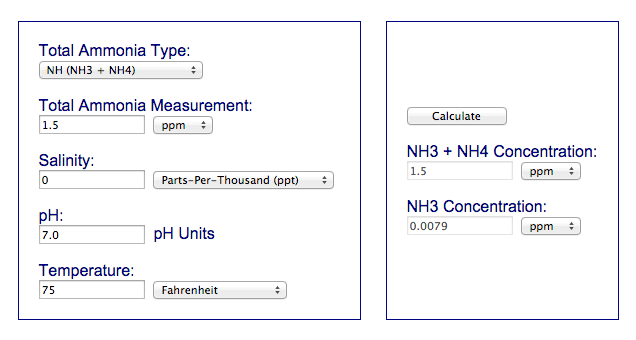 /www.hamzasreef.com/Contents/Calculators/FreeAmmonia.php you can determine how much of the ammonia is actually the 'dangerous' variety. You MUST keep the levels under 0.05 ppm of the dangerous variety, if I remember correctly, though it is different for different species.