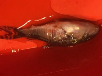 Within normal limits until today. Swimming towards the top of the tank, and seemed to be having trouble (I noticed this while inspecting my tank in the morning). Rather quickly upon inspection, I noticed what appeared to be eggs on the side of one of my peppered cories. I immediately removed it from the tank for closer inspection, and soon noticed that these "eggs" (which I was not at all convinced were eggs) were coming from her. Hubby and I both investigated to see what we could find out (which was very little). Upon examination, there appeared to be some internal bleeding, and so I made the decision to put her down. I'm a health care practitioner--and it eats me alive when something like this happens. After she passed, I took the liberty of doing something I told myself I would never do--a fish autopsy. At first I thought maybe the eggs were from another fish--I scraped them off, and did not see any visible damage, however, it felt like there might be an open area. At this point, also, they did INDEED appear to be eggs as they kept an autonomous shape in the water. Wanting to know what was going on to ensure the safety of the tank, I decided to dissect her--which I have reservations against. No sooner had I made the first incision, than an enormous amount of eggs came out. I imagine she was impacted, though I haven't figured out more of the story than that at this time. Hoping for some answers from more experienced keepers than myself.