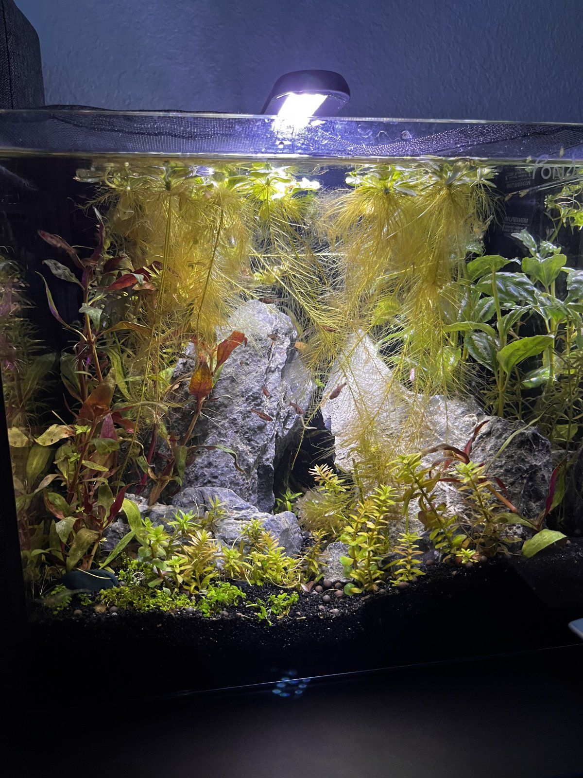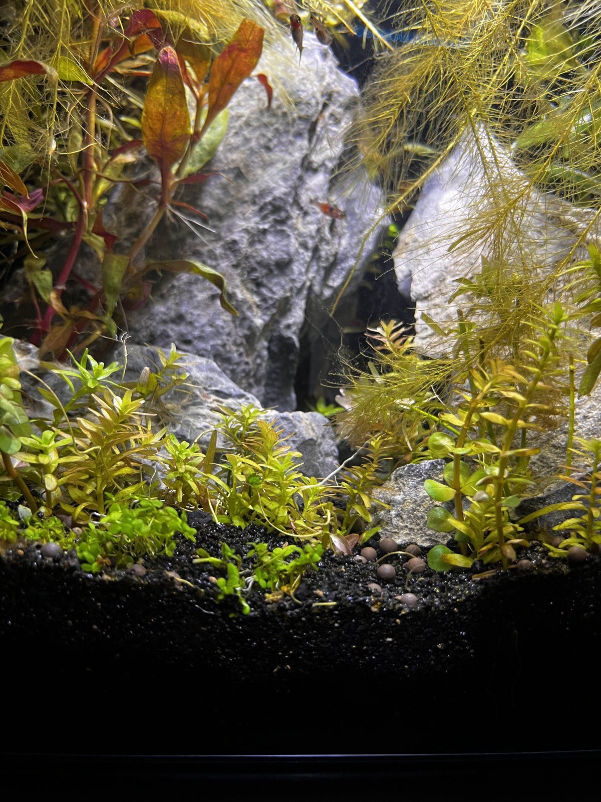 I have had this tank setup for about a month, and was wondering if everything looks healthy. Looks healthy and the fish are thriving, only fish I’ve lost was one that jumped out of the tank, which I fixed by cutting a screen to size to fit the top. The plants seem to be doing good, and for the substrate I have regular fish gravel with some fluval stratum mixed in, but just ordered root tabs because some of the plants started loosing leaves, but the plants are constantly growing. Is this something I should be worried about?