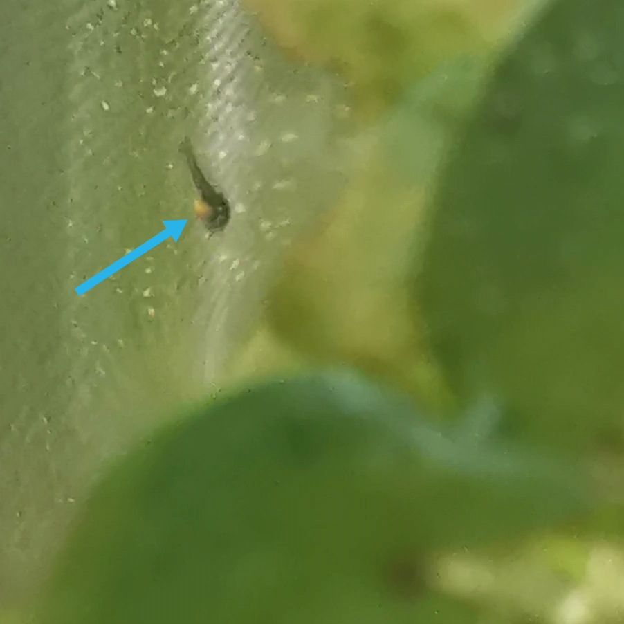I'm very glad it's out I was having a hard time keeping the box clean and working around the one egg, now dangling from a small stem and,I can see the black part. Now that I have seen it I feel better about judging if the eggs are viable, which clears up my confusion