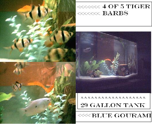 29 gallon:5 tiger barbs, 4 red eyed tetras, 1 blue gourami, 1 redfin shark, 1 pleco, 1 guppy 10 gallon: 2 small goldfish 1 gallon: i male blue and red betta empty: 5 gallon, 2 gallon, 3 gallon, 1 gallon