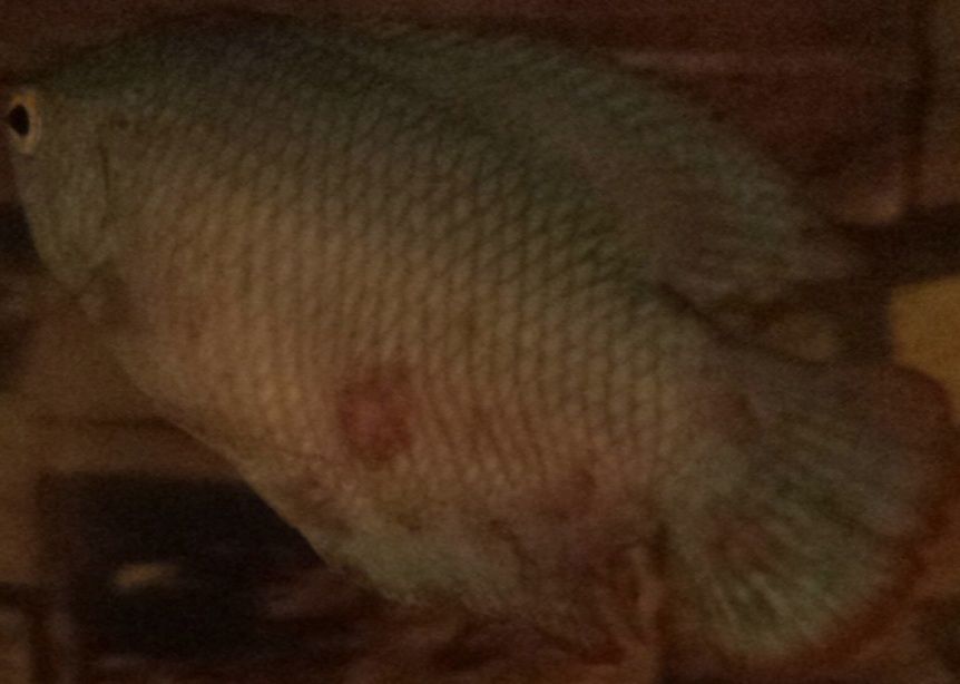 Hey this is my first post but my blue dwarf gourami is having some problems lately, he has been settled in tank with 2 african dwarf frogs not clawed, 1 small Pleco and 4 minnows and the water is fine just he seems sick he started hiding the other side of the filter where it's darkest, and wouldn't swim to top to get food like normal but was still eating, he now has some marks on his back I have got this picture best I could get, have tried using this ulcer treatment but he still seems to be very unhappy.