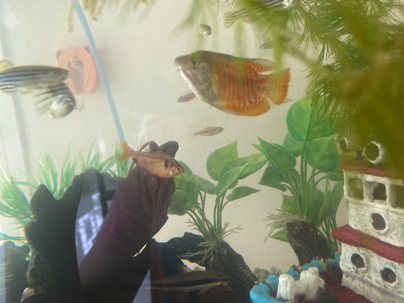I have recently gotten these two dwarf gouramis. As you can see the blue one has a bitten tail as the other bigger red one keeps on nipping it. How do I solve this problem without needing to return my fish to the store? Would the red dwarf gouramis eventually stop doing it? Thanks
