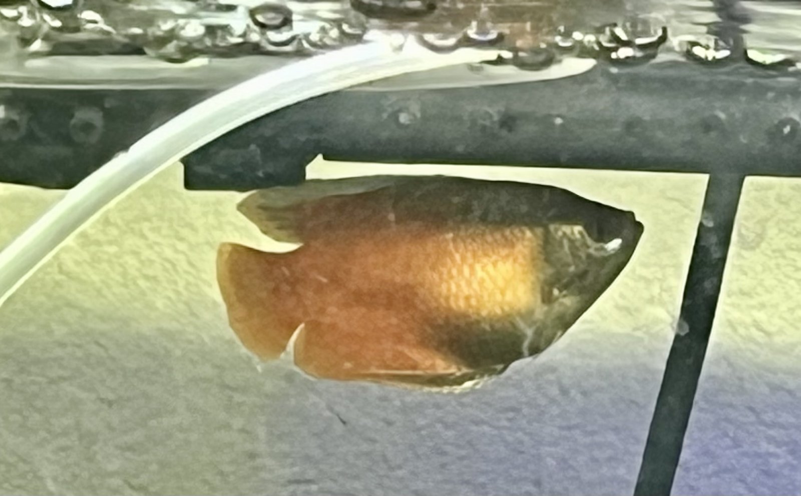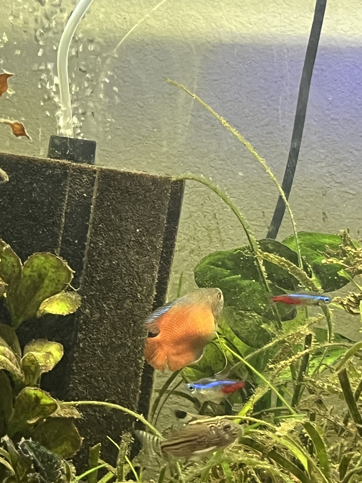 I have a dwarf flame gourami that is not acting normal. He has been hovering underneath of a spout and it has not acted his normal feisty self and his stomach looks distended. He seemed to want to eat this morning, so I'm not sure that anything's going on but I know that he's not his normal self. I have a picture attached that I think you can tell how his stomach looks distended. Can someone give me some pointers on what could be going on?