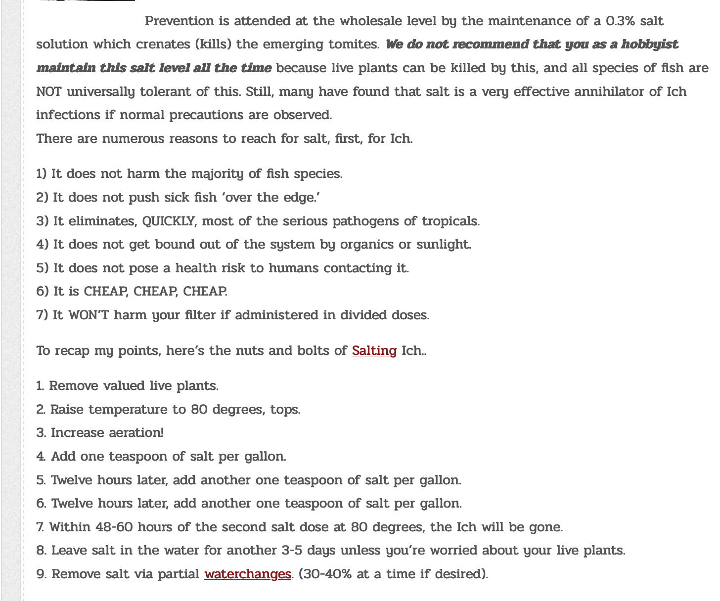 "Still many have found that salt is a very effective annihilator of Ich infections if normal precautions are observed"