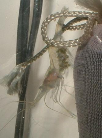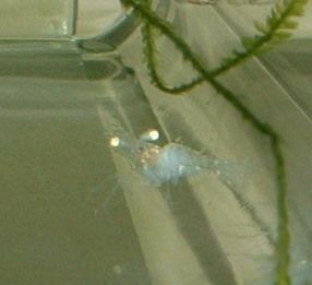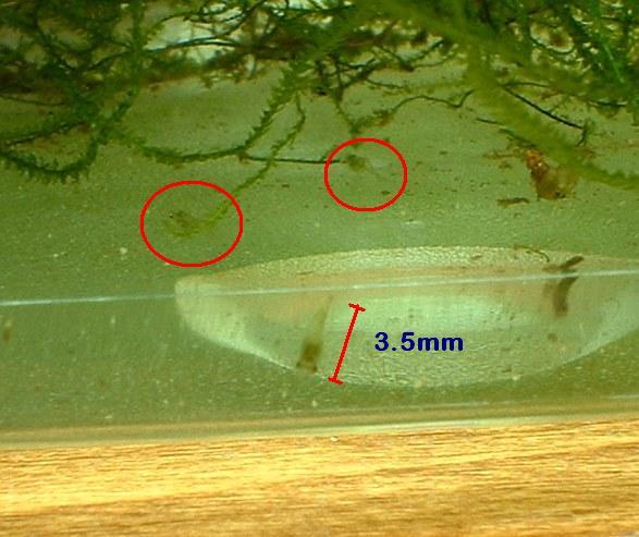 Smaller pic is a month-old juvenile of the 14 who made it from first clutch of eggs; note that despite being one month old, the two strands of Java Moss in the pic are still relatively large. Really, they have a decent survival instinct; when I approach w/ the digicam, they all make a run for the java moss forest. B) These guys grow incredibly slowly.