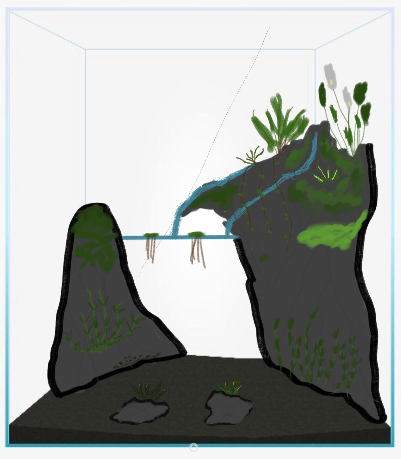 Some of you may know I'm working on constructing a completely custom tree frog vivarium. I want it to have a water feature with a little waterfall type thing, but since frogs are messy creatures, I'd like it to have some semblance of actual filtration instead of the one or two small pieces of foam most people use in these applications (usually just for keeping particles out of the pump). This means making a dedicated, blocked off space for media. I'd like to know if this mock-up looks like something that could work.