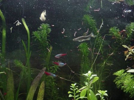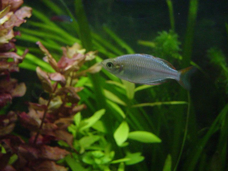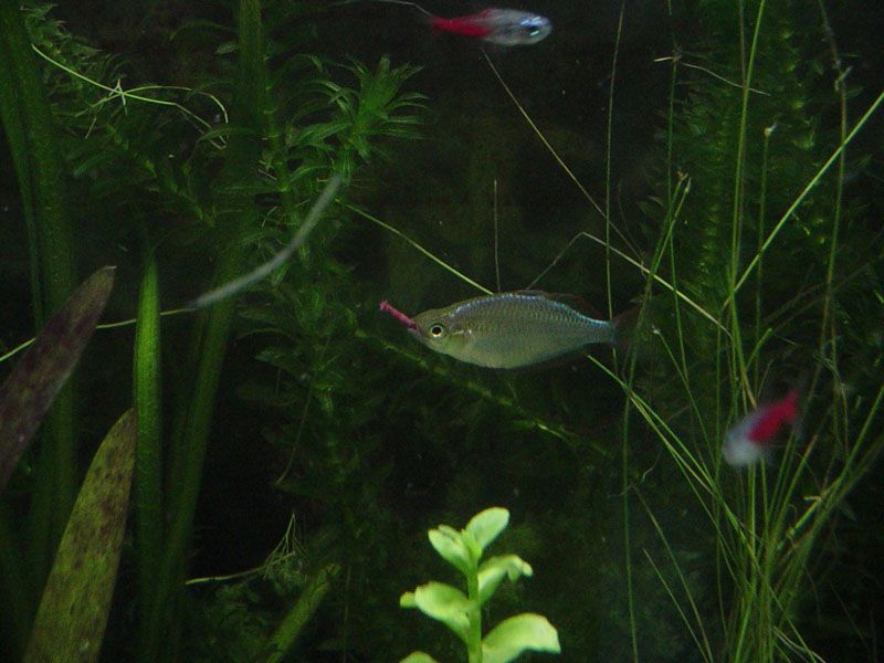 Another one of my male rainbowfish, I had to take the opportunity to get a decent shot of him while he was trying to handle a large piece of bloodworm he'd got in his mouth.