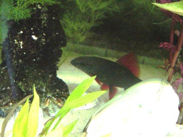 And finally a picture of the supreme master of the tank, my rainbow shark, who you can only see cos I messed with the brightness and contrast (very clumsily!) so it looks a bit dodgy She is defending her fortress