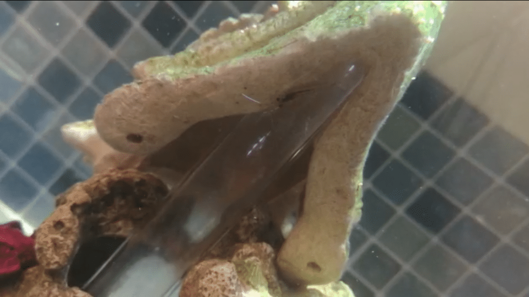 As you can see, her tail has basically all gone and a lot of her top fin too. She's actually weirdly mobile considering she just has a stump but she's not currently eating in her little box. As she's closer to the light, I'm having the light on less so it's not as bright as on her.