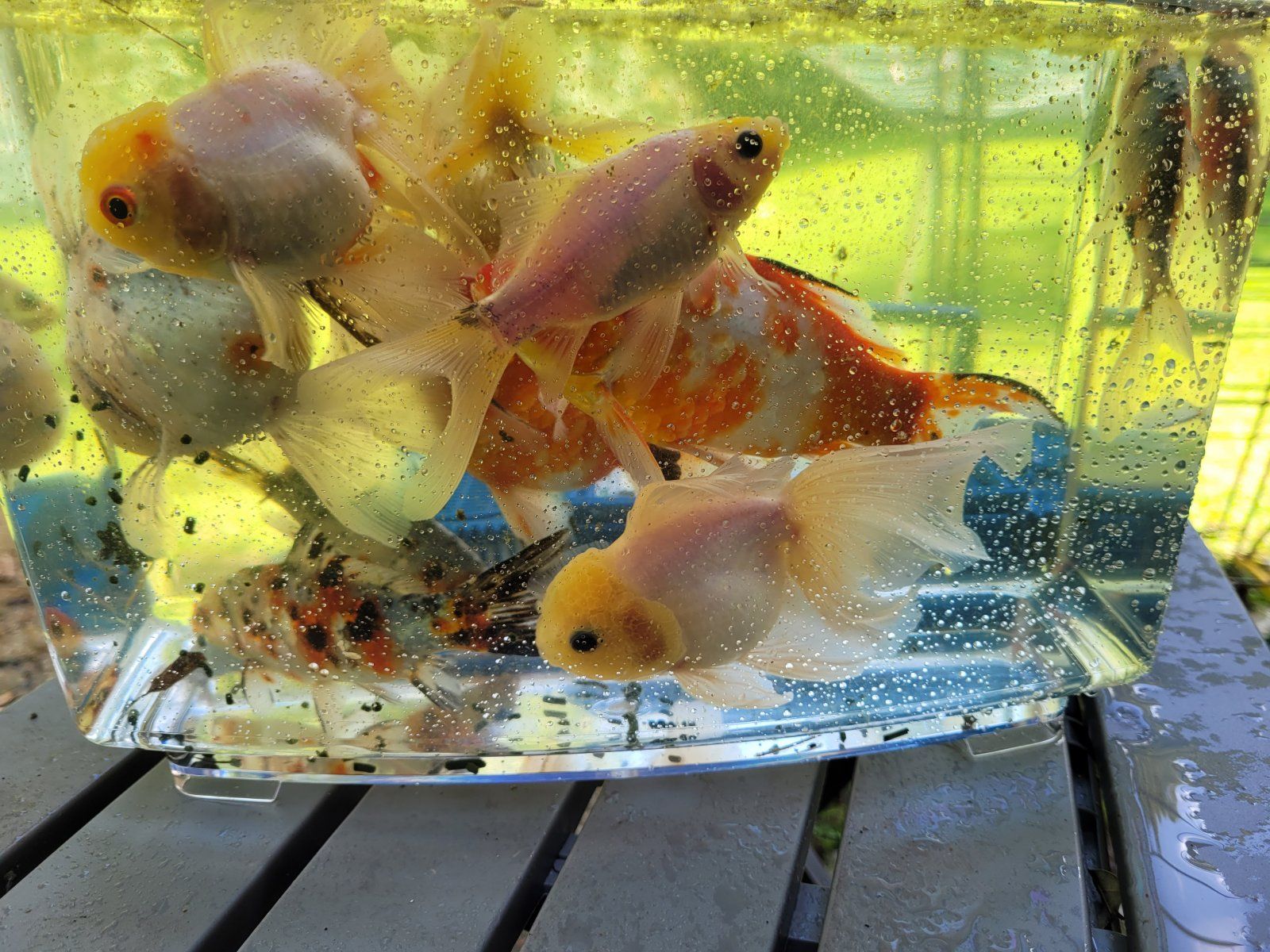 They waited here while I cleaned their little pool. These are my babies. The smaller shubunkins were born in there this last winter/early spring and somehow survived in the green water so I just kept them. The two larger shubunkins came from Petco a few years ago.