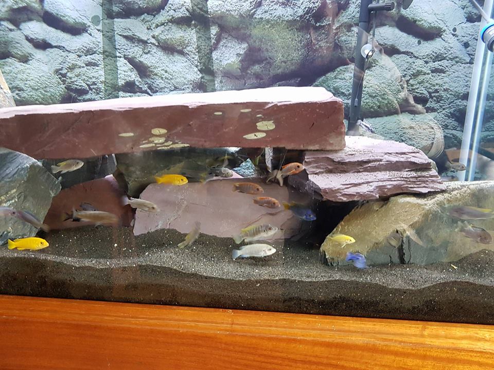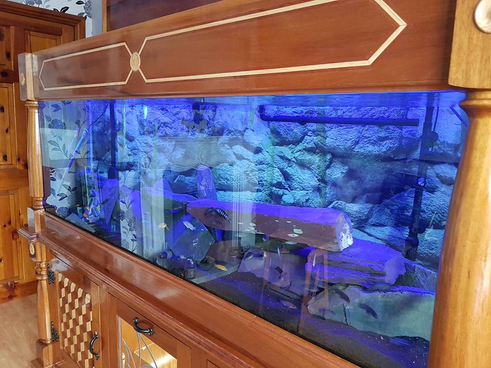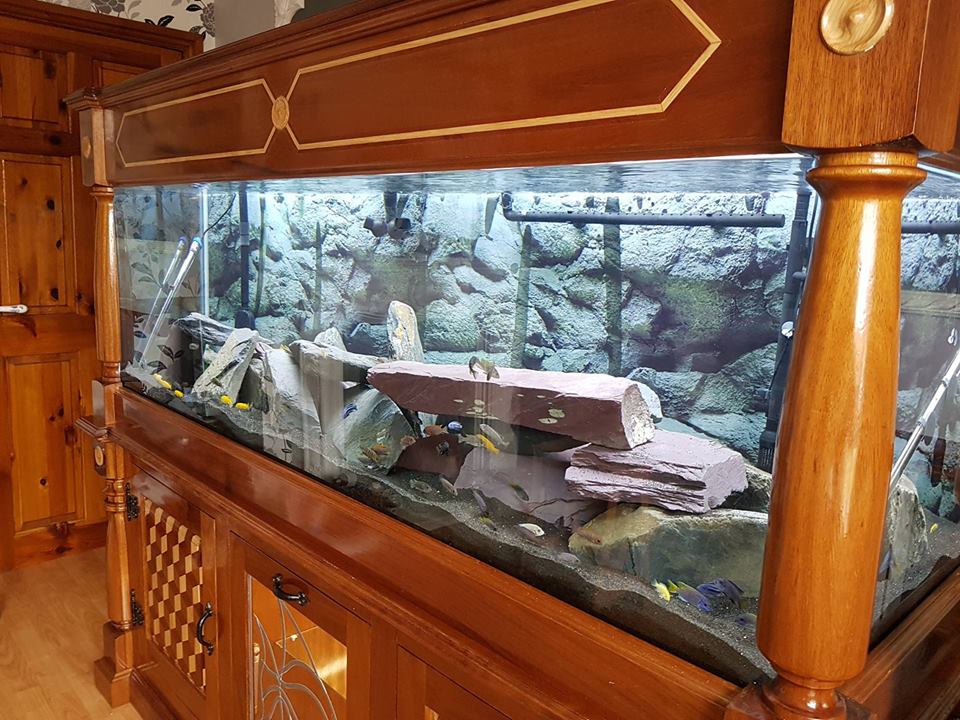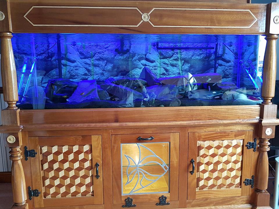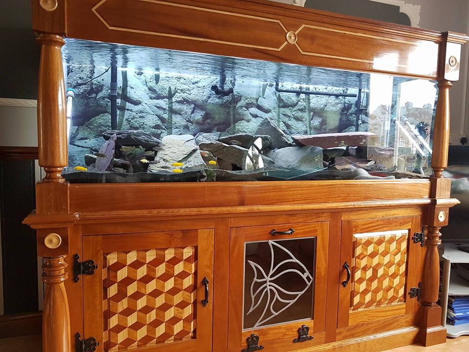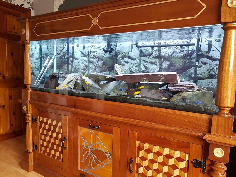 here is my tank stocked with 63 mbunas .............i built the stand myself from mostly iroko with some oak and sapele thrown in