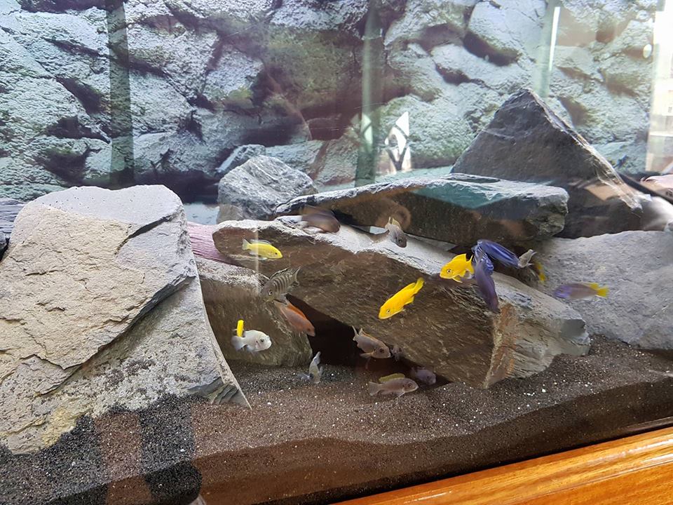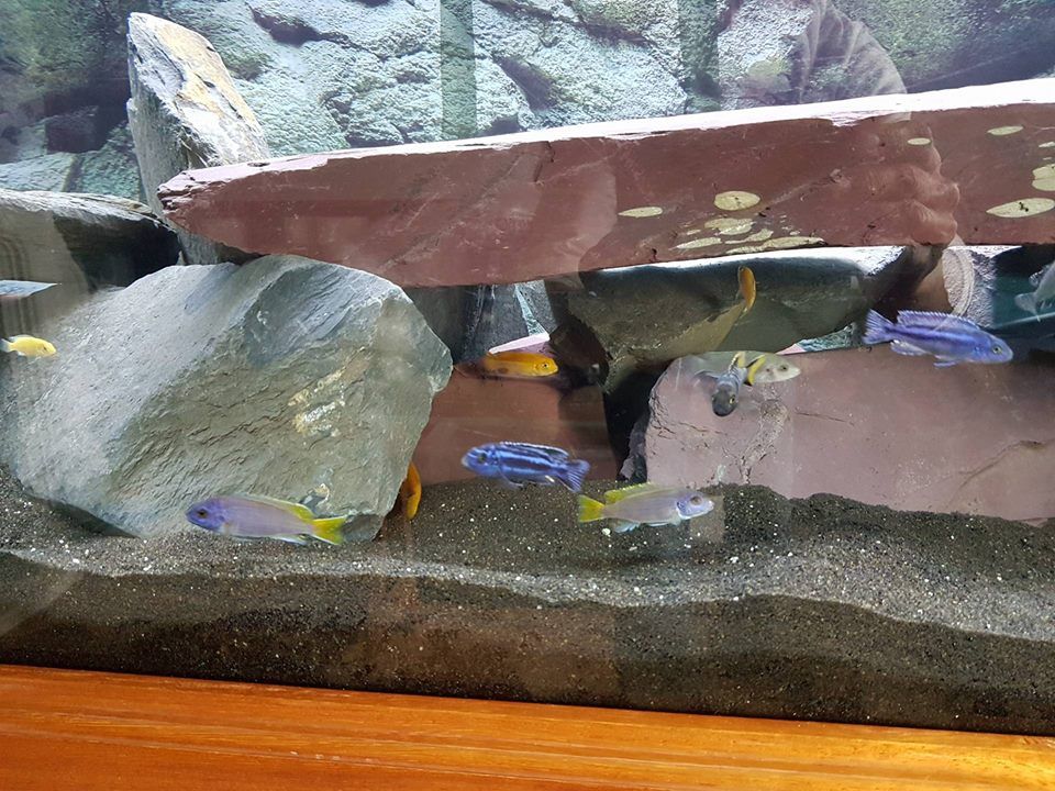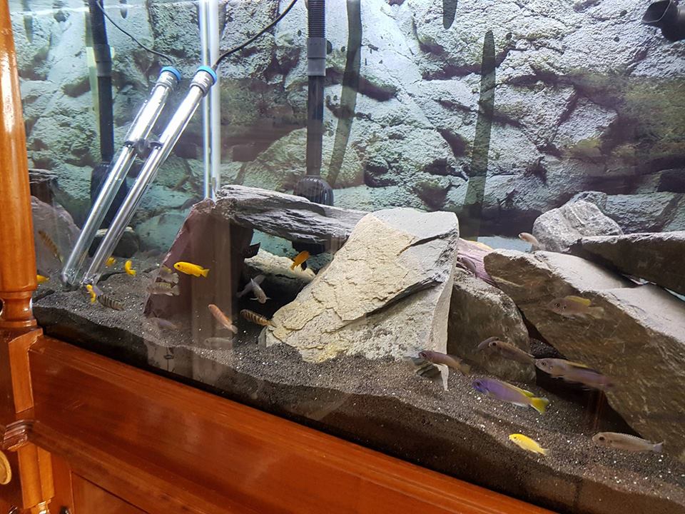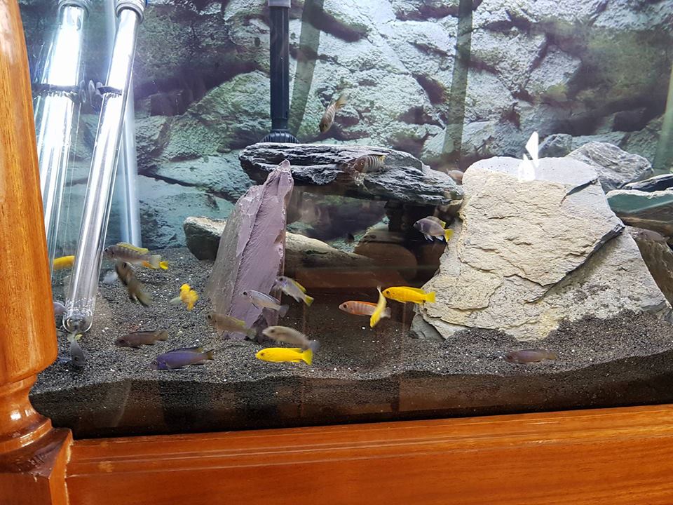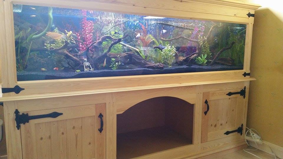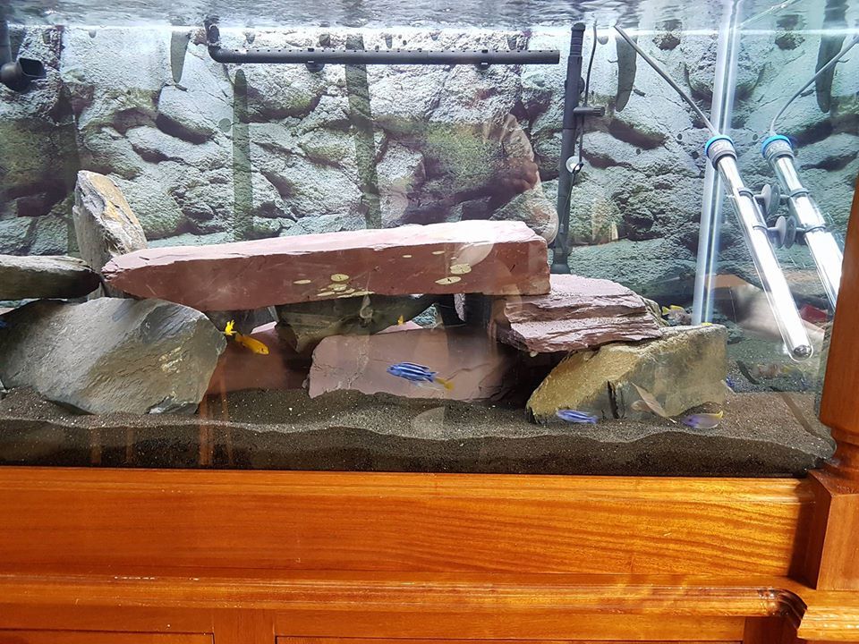 here is my tank stocked with 63 mbunas .............i built the stand myself from mostly iroko with some oak and sapele thrown in