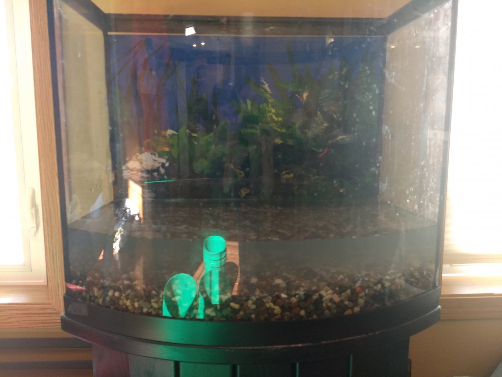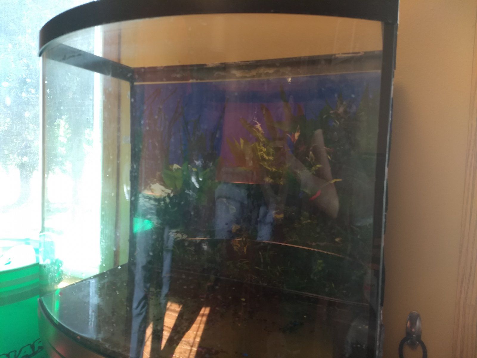 Then we took all of the fake plants out, and removed the tank from its stand. We emptied the clown gravel as best we could using cups, then we took the tank off of its stand and outside. We emptied the rest of the water by tipping the tank over, and used the hose to spray out the rest of the gravel.