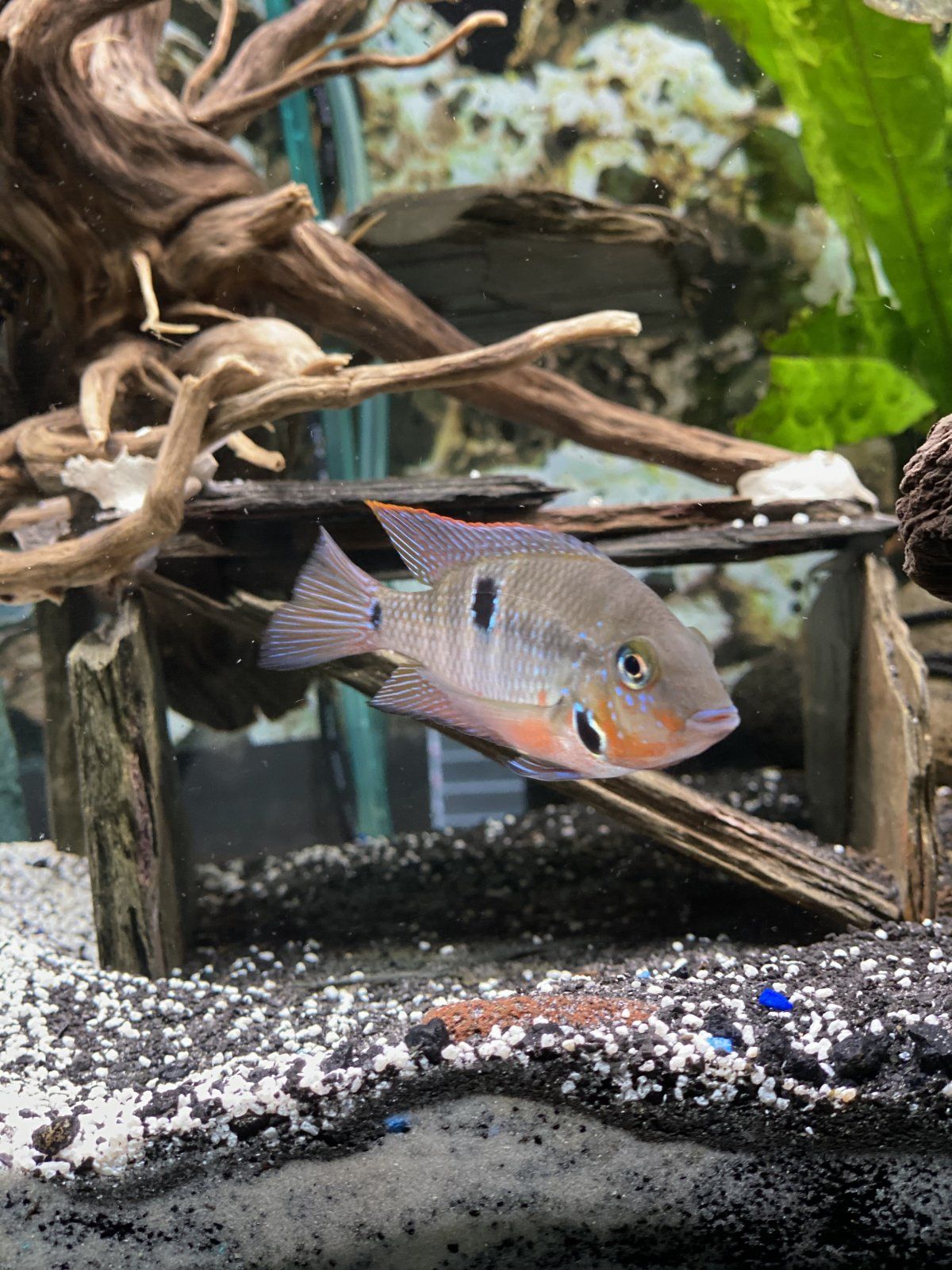 So 6 weeks ago is when the firemouths were first introduced into my aquarium which at the time was housing two gold severums, six rosy tetras, a large synodontis, two heckelii and two bolivian rams... This setup was quite peaceful and did not have any significant problems.. Then I took a plunge and added two firemouth cichlids. I thought because I have two years prior of experience with this fish I'd be able to pull this off however a common misconception is that Firemouth cichlids are actually often reffered to as peaceful for cichlids which is very incorrect. These fish have fiesty personalities and are alot more predatory than people including me thought. The first time I owned them they terrorised my smaller community tank but somehow I managed to get a grip of the aggression and ended up with harmony. Note that this setup did not include any other cichlids and the firemouths still at first were terrors. So with this in mind I thought because my tank now is so large and now full of sight blockers and bigger cichlids they won't bother the other fish and oh how wrong was I? The male who bearing in mind is still classed as a juvinile and smaller than most of the cichlids is already king of the tank and will display his warning gill extentions to any fish that even came close to the far left corner of the tank and chase away even my female gold severum which was unreal to see! But he settled down since then and will still occaisionally chase away every other fish he can and especially during feeding time.. My advice to any new cichlid keepers is do not mix central and south american cichlids! I am taking so much time and effort still to make this work and I just got lucky with my firemouths being alot more docile as if they continued how they were I'd have to take them straight back which I would hate to do as I really do love firemouths! Second word of advice.. Even a 75 gallon tank Isn't enough to stop firemouth aggression. These fish really should not be kept in community tanks unless you can put in alot of effort into the tank and using trial and error with the tank to disperse aggression, I got extremely lucky with my fish and I know unfortunately alot of other people have not. Firemouth cichlids are truly stunning fish and have great personalities but in the right conditions they have the capabilities of destroying balanced tanks overnight! Biotopes are the best way to go and I really would advise against mixing them as even though I somehow stopped alot of aggression, I'm still having a few minor issues which could have been avoided all together with just properly thinking every possible scenario through. I hope my experience has helped anyone wondering why people say do not mix cichlids from different biotopes! The final answer is because of the different conditions, the fish are better adapted to those exact conditions for example south american cichlids are alot more docile with each other (there are exceptions) and seem to form better boundaries with each other. Meanwhile central american cichlids are more rough with each other and seem to heavily defend they're boundaries at all costs breeding or not and I've learned a lot from keeping them