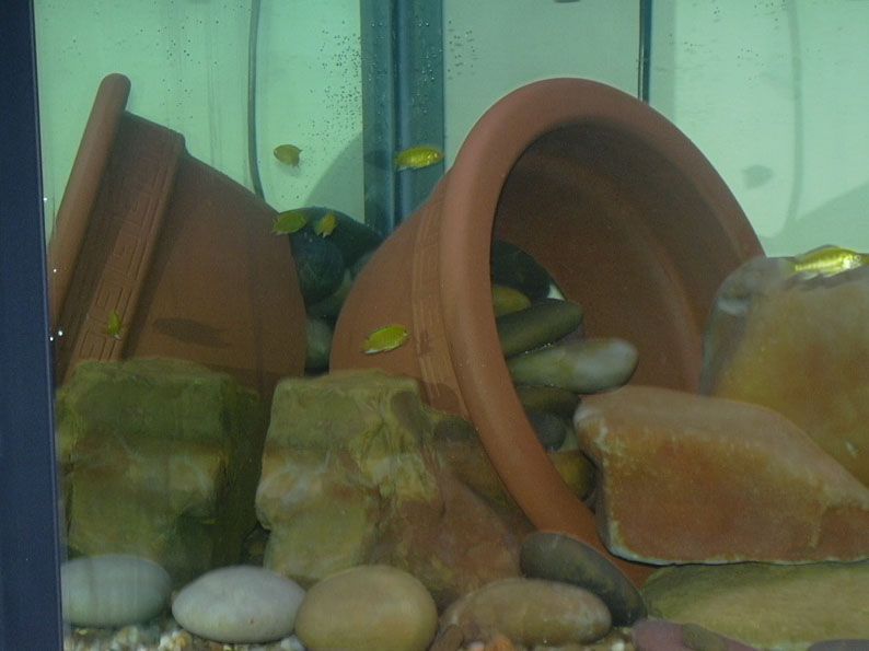 Here they are....my first african cichlids....1 inch long electric yellows busily exploring their new home....I got 6 to start with....more fish in 2 weeks time!!