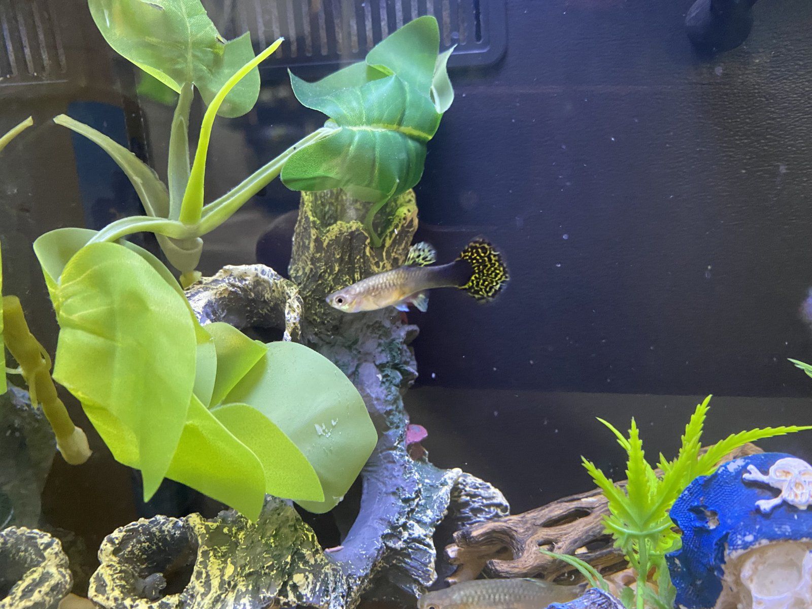 Reason I think the less meals are having adverse effects: I came home last week and one of my male guppies in my 29 gallon was completely devoured. Usually when a fish dies, the body is completely intact when I find them. This time; there was barely a fish left and the only reason I was able to identify who it was because of who wasn’t in the tank. And, if that were it I probably would have thought it odd but brushed it off. To make it double worse, one of my female guppies in my 20 gallon (so a completely separate tank) ate a 6 week old fry whole and when I got home was in the process the pooping the thing out. I attached a photo. Edit: one of my other female guppies had a hollow black ring on her scales that looks a lot like a bite mark too.