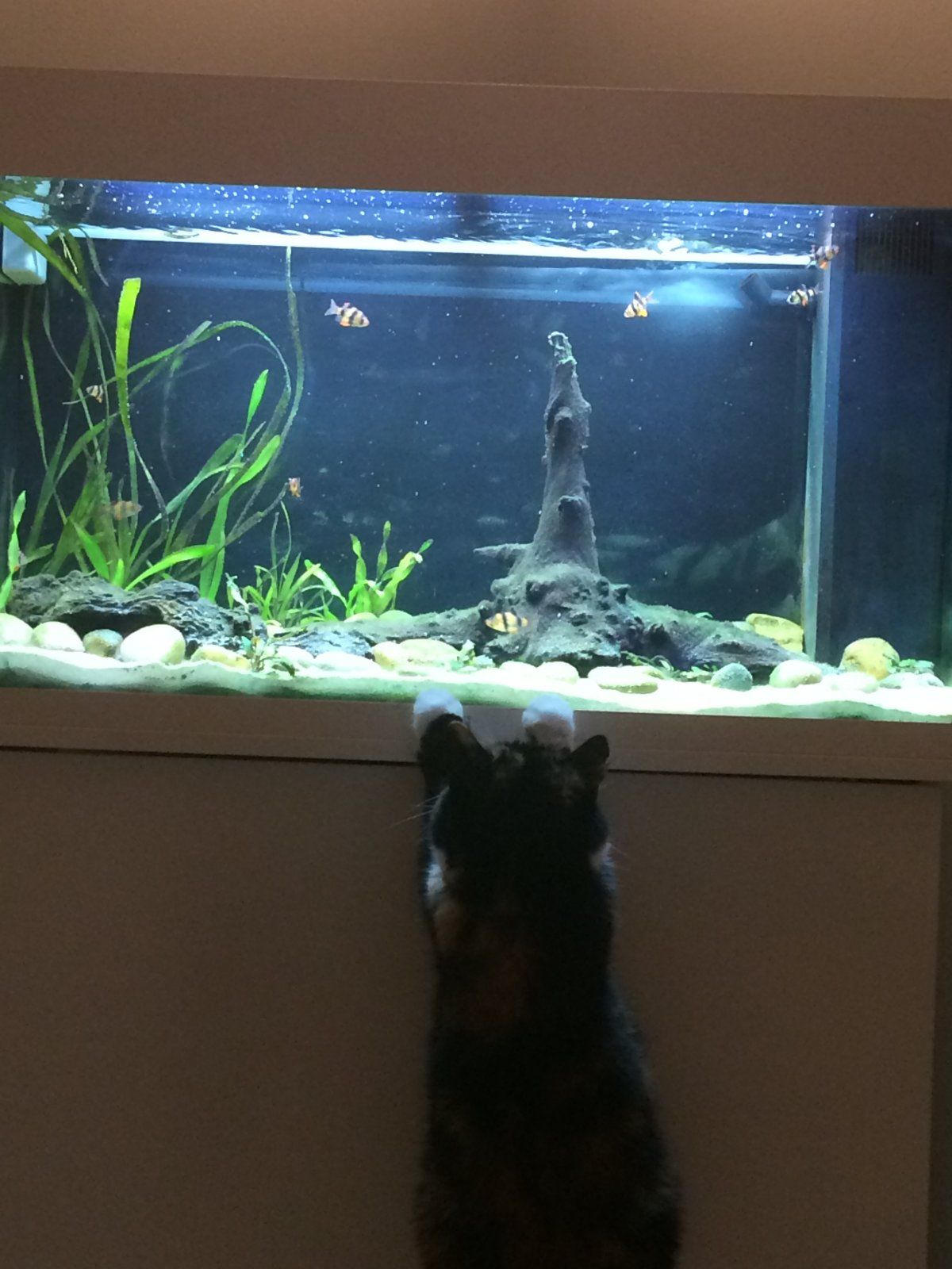 Ding batWe have a tom cat named weasley after Harry Potter's friend Ron. He has the same hair color. When he was younger he would sit and watch the fish in my 55 gallon thank. If any fish would swim close to him, he would swat at them on the tank glass trying to catch them. He would often fall off the couch and land on the floor doing this. Our older black cat (ding bat) will sometime sit there for a hour just watching them.