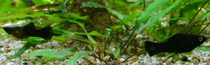 yeah on the right is a black molly, and the left looks to be a guppy, it has a flat head whereas mollys and plattys have a higher back, like the molly on the right. strange, never seen a solid black guppy! might be a black molly x guppy hybrid! lol