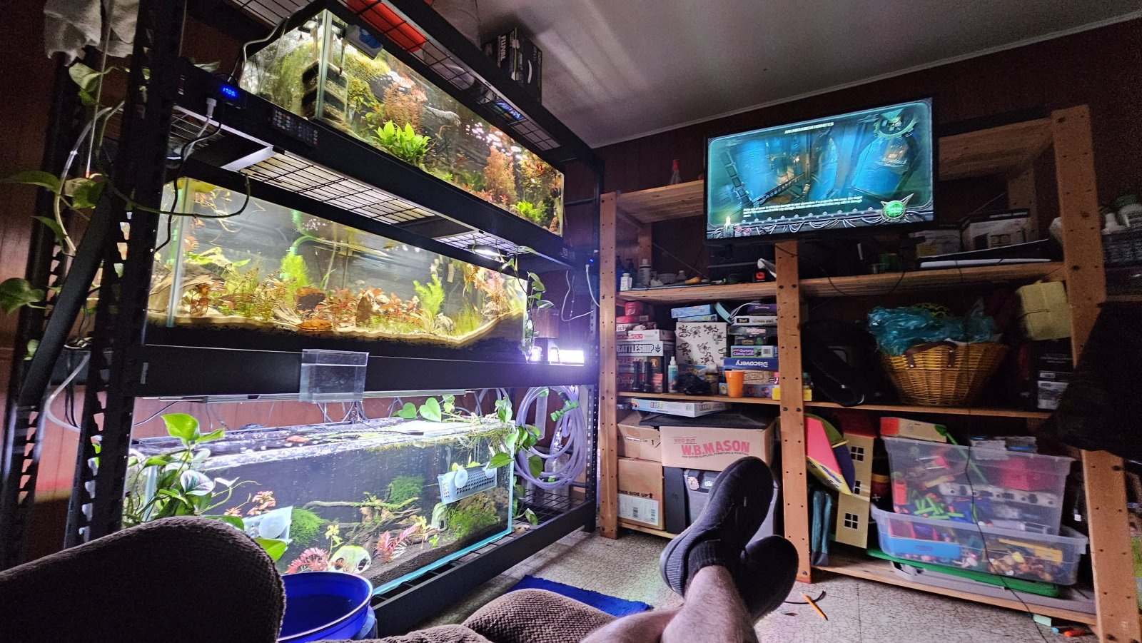 finally got my ps5 and tv mounted. On the top level of the fish rack I will be putting a bunch of 23.62x14.17x7.09" 10G longways tanks for breeding apistos from the main tank and a few grow out tanks. I'm thinking with the length and width the lower gallons won't matter as apistos live in 4" water in the wild