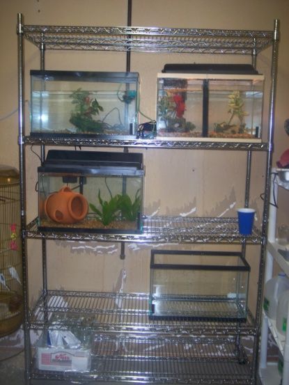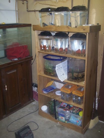 Bettas to the second to last shelf and extra tanks and my net dip bucket on the bottom edit~the kritter keeper that's only half full has a fish with a ruptured swim bladder and that's about all the water he can handle and still be able to breathe and eat