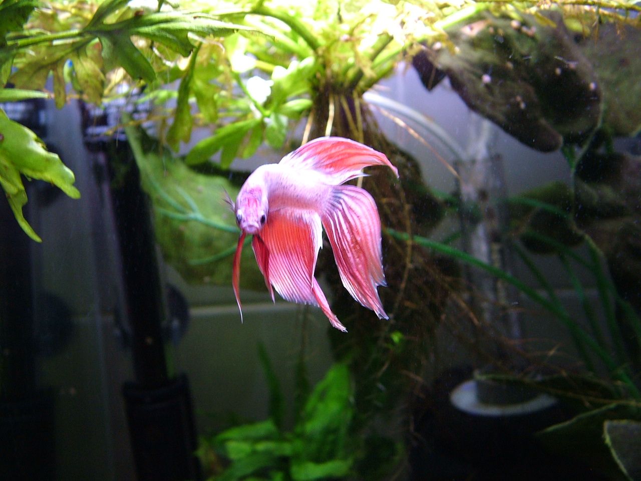 Now I see him hanging around there and flaring at his own reflection.. So I had a closer look and noticed that his bright background is stuck to the tank's back wall and created a little "mirror" where he sees his own reflection and flares at his own reflection thinking its another betta!