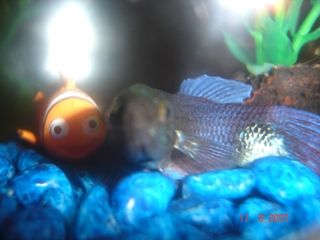 I don't know the age of my fighting fish, Fred, but I bought him from the local pet store in May 2005 for a school science project. He has this... white growth on his butt (where the poo comes out). This developed quite a while ago... I can't remember exactly when, but I'm sure it developed last year. I was thinking it would be fatal so I was super nice to him, but he is still alive, fortunately.