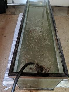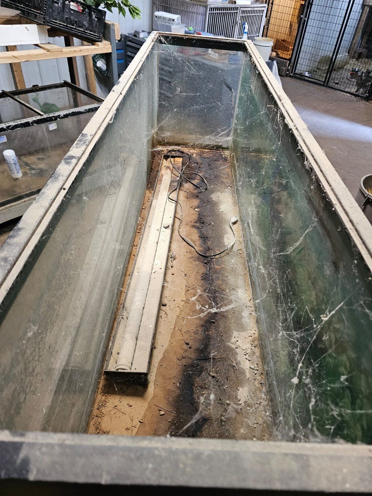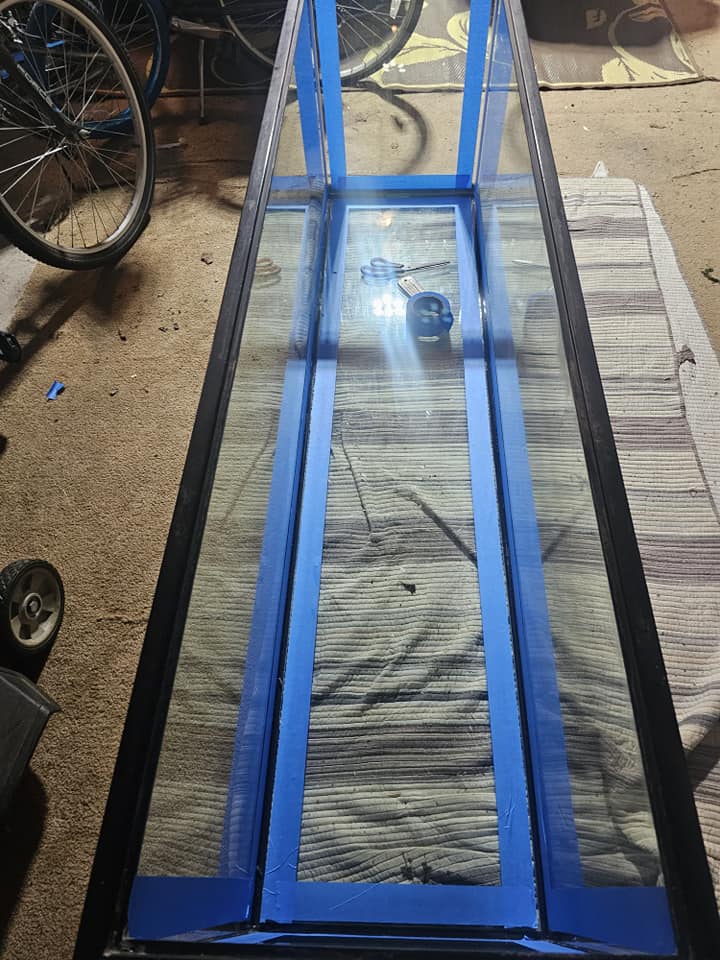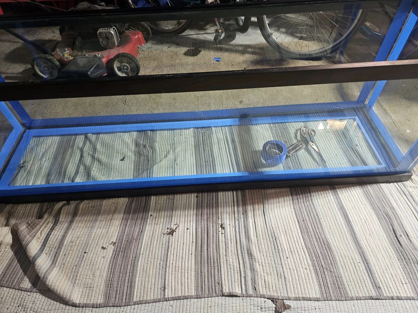 This was hard work and I didn't think I was going to be able to salvage it. This tank was sitting in a storage barn at a closed Private Zoo. They had had snakes in it for a short time. The building leaked so the inside and top got wet. I had to toss the cover, it has wood rot. I filled it with water to see if it leaked and left it that way for two weeks. No leaks but as I started cleaning it, the silicone was peeling from the corners. So I stripped it, retaped and plan to silicone it in the morning. The silicone I got was from Amazon, supposedly it seals up to 750 gallons of water. This being a 120-gallon, thought it be fine. My goal is to caulk it, let it sit two weeks to cure, then fill it with water and let it sit for another week to make sure it isn't leaking before I bring it in the house.